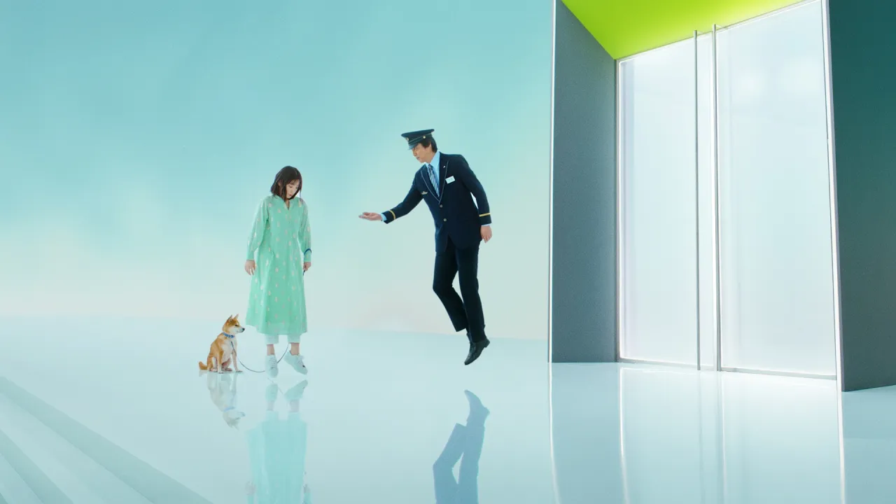 While saying he’s “so giddy from the grand opening that he’s floating,” Shinichi Tsutsumi, literally hovering in the air, leads Ami Toma on a tour of Takanawa Gateway City.