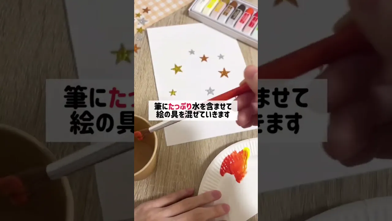 Stick star, heart, and circle motif stickers onto construction paper, then brush on paint thinned with water.