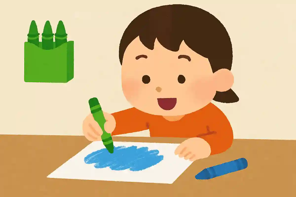 Since we want to draw “blue,” it’s fine to use crayons of other colors. If you actually draw while explaining, it will be easier for the children to understand.