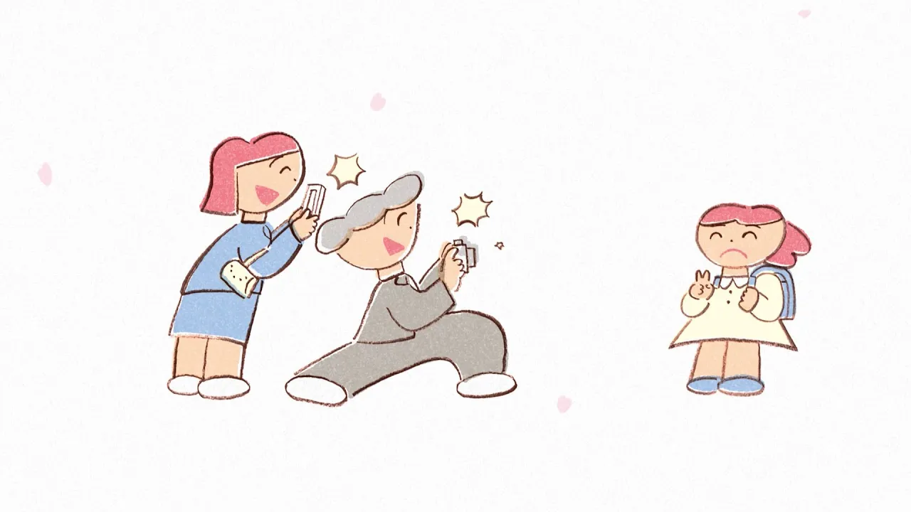 The parents are earnestly taking pictures of their daughter wearing her randoseru backpack, while the girl being photographed looks a bit overwhelmed.