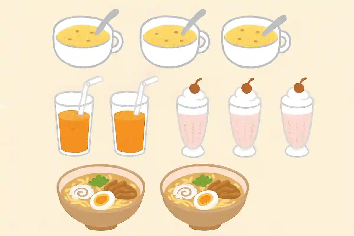 수프 3그릇, 주스 2잔, 쉐이크 3잔, 라면 2그릇. 합해서 몇 그릇이에요?