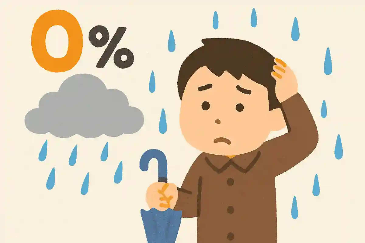 일기예보의 강수확률 0%는 절대로 비가 오지 않는다는 뜻이 아니라, 비가 올 가능성이 매우 낮다는 의미입니다.