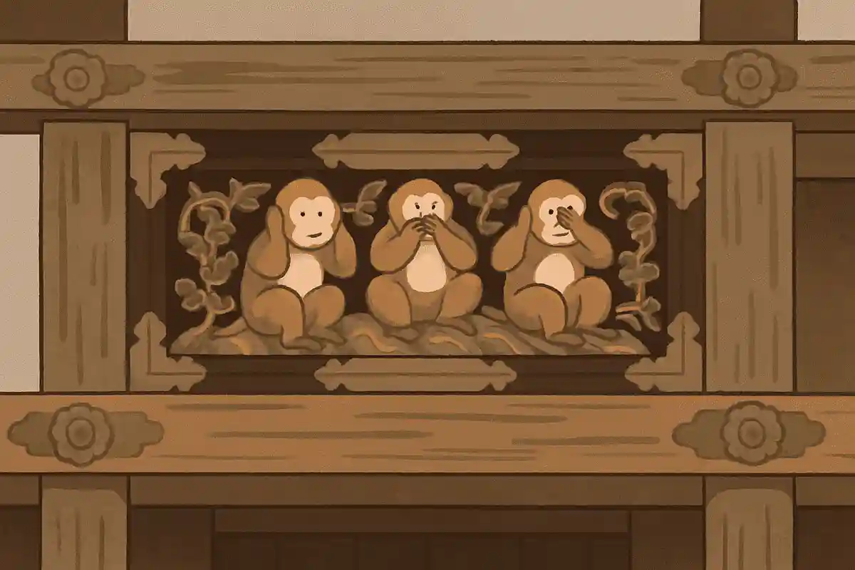 세 마리 원숭이는 ‘보지 말고, 듣지 말고, 말하지 말라’를 나타내는 원숭이 조각입니다. 닛코 도쇼구의 신마구사(신의 마구간)에 새겨져 있으며, 세계문화유산에도 등재되어 있습니다.