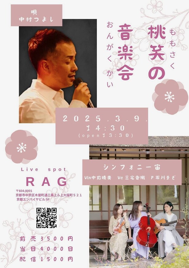 オリジナル曲「愛のカタチ」がヒット、シンガーソングライター、歌唱・発声指導者としても活動中の中村つよしとのコラボライブを弥生3月のRAGにて”桃笑(ももさく)の音楽会”として開催します。