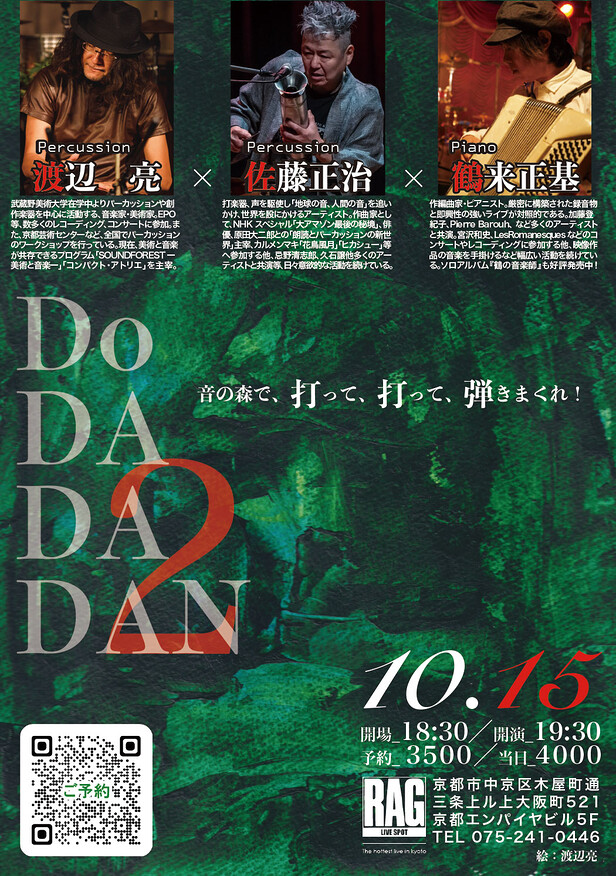 そんな”マサ”さんが、京都在住で全国各地で活動する、パーカション渡辺亮とピアニスト鶴来正基と共にお届けする”Do DADADAN”の第二弾が急遽決定です!