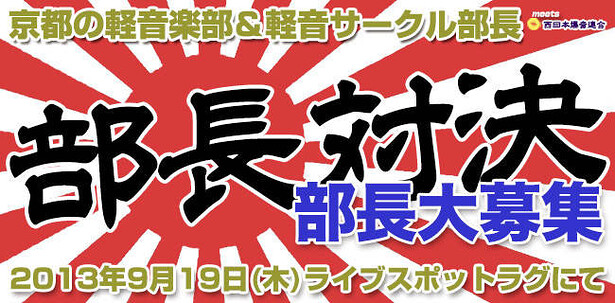 京都の大学の、軽音楽部&軽音サークルの各部長&副部長がライブスポットラグに集結し、完全熱血ライブをスパーク!入場500円!どの団体が勝利するのかお楽しみに!