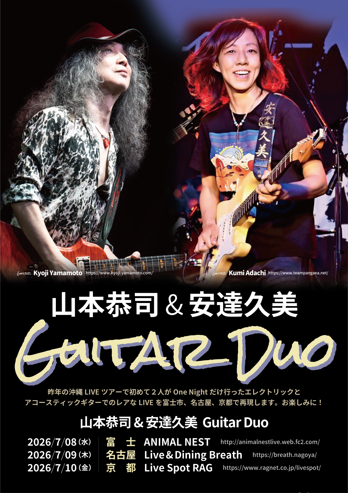 昨年の沖縄LIVEツアーで初めて2人がOne Nightだけ行ったエレクトリックとアコースティックギターでのレアなLIVEを富士市、名古屋、京都で再現します。