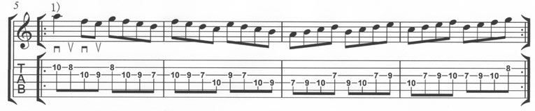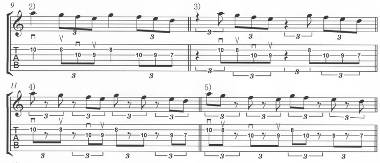 まず(譜例1)を演奏したら、(譜例2)から(譜例5)のようにそのバリエイションとして、同じ階段を4小節パターンで繰り返していくのです。同じ音形もリズムのバリエイションを加える事でずいぶん印象が変わるでしょう?ピッキングの手順が同じなのもポイント。