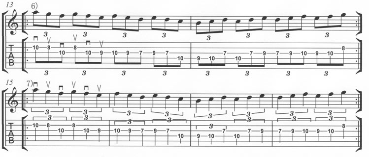 ここまで休みなくフレーズを変化させながら、ノンストップで弾き続けることがこの練習の完成形です。このスケール練習が3連符の練習の風情を醸し出したところで同じスタート地点から3連符を階段状に弾きます。(譜例6)を弾いたら(譜例7)を弾きます。同じフレーズが半分のテンポになったものです。