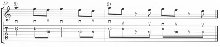 同じ音形をさらにリズムのバリエイションを変えて(譜例8)(譜例9)と弾きます。ここまで来れたら、また(譜例1)に戻って弾き始めます。