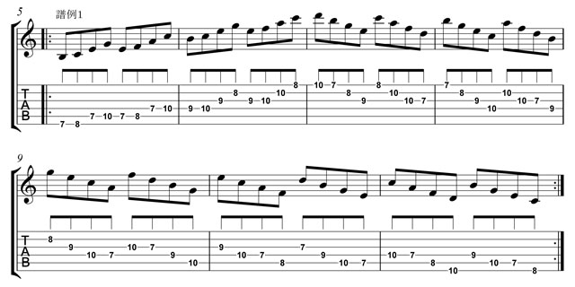 譜例1)は、Cメジャースケールの音を一つ飛ばしに拾っていく練習です。僕は、こういったフレーズは下がるものの方が工夫のしがいがあると思います。だから、早めにあがって、じっくり下がるフレーズを用意してみました。