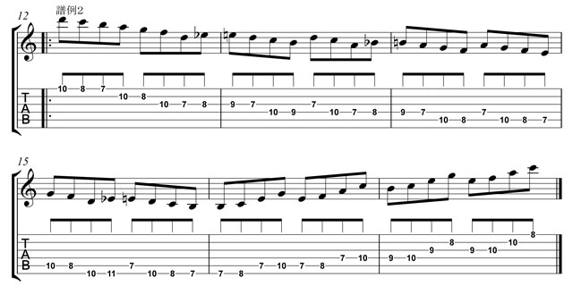 最近では「ギターでスケールを弾く」=「テクニカル派」「ジャズっぽい」と世間が捉えているように感じます。しかし、いざ作曲する時はドレミでギターを持った瞬間、ペンタ一発というのは、感性がうんぬんという前に不勉強でしょう。ここは、スケール練習をメロディアスに聞かせる為のごく常識的なアイディアの一例です。