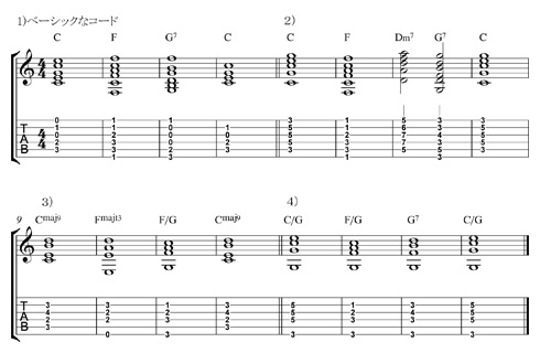 ちなみに、ある曲にこういうコードが付けられるとします。これらは、コードのバリエイションとしていずれもアレンジの大事な範疇に入るものです。バンドみんなの意思の統一があれば、状況により変える事も可能でしょう。特に3小節目は、ちょっとした変化を付けられるものです。<1)から4)参照>