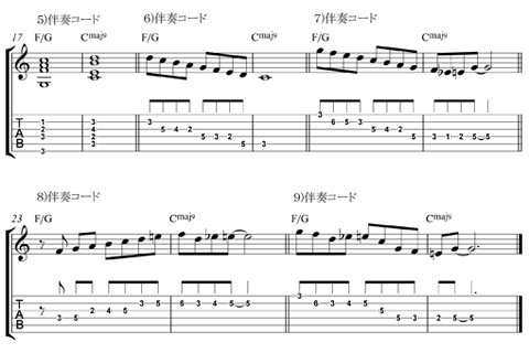 簡単なフレーズを例にとります。伴奏のコードを誰かに弾いてもらいます。そこで6)以降のメロディーを弾きましょう。